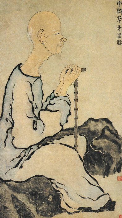 《丁敬像》是罗聘肖像画代表作之一。画中人物丁敬(字敬身, 浙江杭州人, 金农知友, 工诗书, 尤精刻印, 格调清劲朴质, 开创“浙派”篆刻艺术)倚杖坐石, 光顶高额, 脑后几许白发, 头颈伸得特别长, 造型夸张,“怪”中见美, 拙中含趣。