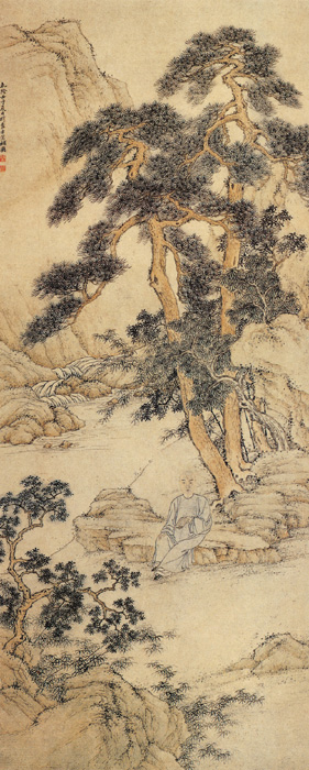清 吴榖祥 纸本设色 纵116.5厘米 横25厘米 北京故宫博物院藏 怡园主人为顾文彬(1811—1889),字子山,元和(今苏州人),1841年为进士,官至浙江宁绍道台。怡园原为明代尚书吴宽的旧宅。清代为顾文彬所得。同治年间文彬之子顾承为设计怡园,与当时在苏州的画家任阜长商量,任阜长推荐虚谷设计,文彬因虚谷为和尚而加以反对,便请阜长设计。他吸取苏州园林诸优点,独运匠心,使怡园成为苏州园林中景观丰富精美的私家花园之一。顾文彬坐在松树下的石块上,手执书卷,身穿圆领长衫,衣纹线条遒劲,表现出文人士大夫的风度。 |