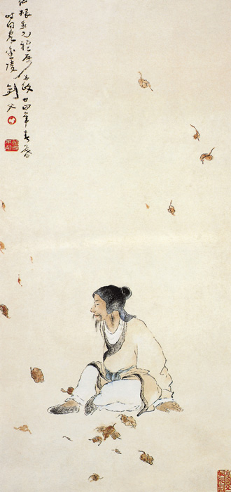 高剑父 纵73.5厘米 横34厘米 广州美术学院藏 历来有些文人墨客看到秋景而伤感。“悲秋”一语出自《楚辞》宋玉九辨。唐代诗人杜甫在《登高》一诗中有“万里悲秋常作客,万年多病独登台”句。高剑父画《悲秋》可能亦是受到前人的启示;是画家飘泊在异乡的亲身感喟。画面上一老者、裹着头巾,长须短髭,神态沉郁悲凉,席地而坐。在秋日天高气爽时,却刮起了猎猎大风使树叶黄落,百卉凋零,给自然界和人间带来一片秋风秋色、秋容秋态。值得注意的是,高剑父画这幅画时,正在南京中央大学艺术系任教。画家是否寓情于画?非常真切细腻地表达了作客异乡的游子见到这一切凄凉摇落之景,不可避免要勾起飘泊异乡的凄寂情怀,想起了对家乡新人的深切怀念。 |