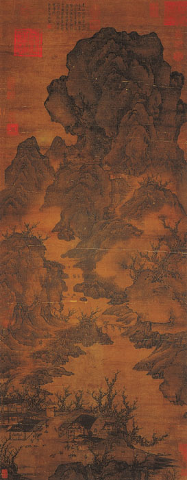 五代 关仝 绢本水墨 纵144.4厘米,横56.8厘米 台北故宫博物院藏 关仝,又名童或同,长安人,工画山水,师从荆浩,刻意力学,遂自成一家,时人称“关家山水”。他所作山水笔简气壮,景广意长,与李成、范宽齐名,在北宋号“三家山水”。《关山行旅图》是关仝的代表作,画上峰峦叠嶂、气势雄伟,深谷云林处隐藏古寺,近处则有板桥茅屋,来往旅客商贾如云,再加鸡犬升鸣,好一幅融融生活图。此画布景兼“高远”与“平远”二法,树木有枝无干,用笔简劲老辣,有粗细断续之分,笔到意到心到,情境交融。此外,画家在落墨时渍染生动,墨韵跌宕起伏,足见关仝山水画道之精深。 |