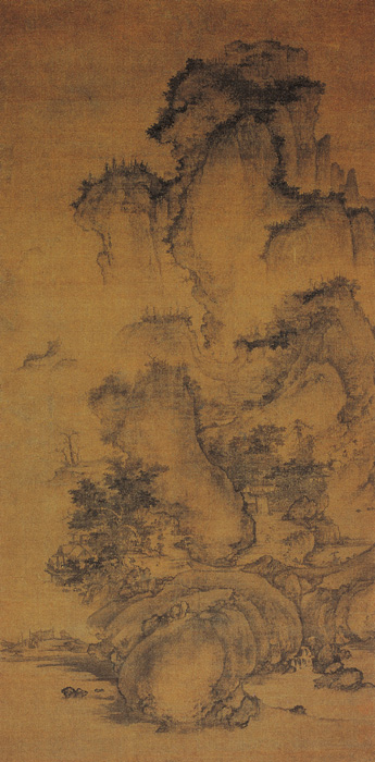 此图于夏季山野风景中穿插村落及隐居的生活。立幅正中是峥嵘巍峨的巨峰,山势奇险在烟蔼中浮现,其下为两山夹峙的峡谷,下部平坦处建有山庄及亭阁,山麓浅沙平岸有渔船停泊,山水中点缀乘轿的士大夫及朴野的渔夫山民,虽寥寥数笔,但人物神情动态跃然于绢素。此图虽无款识,但似卷云状的山石和壮健的笔墨正是郭熙的本色,画中山峦林木郁郁葱葱,展现的是“夏山苍翠而如滴”的风貌。