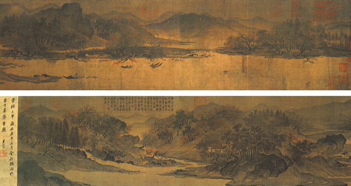 此图画江南平远山水景色。画面前后始终以重山叠岭为背景在这山溪河流中间,岗峦起伏,平渚相牵,其上林木葱郁,花开烂漫,竹林深幽,垂柳依依。画中布局取平远之势,但崇山叠岭,云气蒸腾,亦显境界深幽,而萦绕于山间的河流、湖水与云气融为一片,又使其境空灵渺远。画中笔法温和平淡,近山、林木等勾皴外,山石多以染法,随形变化,浓淡相宜。其敷色简淡,醒目异常,增强了画面春日融融的明丽气氛。此图无款印,传为北宋惠崇作。引首有李兆蕃篆书“溪山春晓图”五字。 |