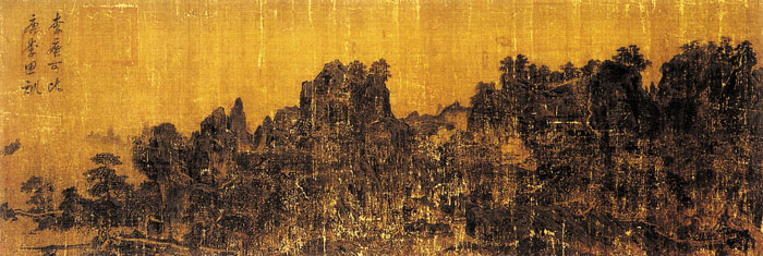 李唐(约1050—1130),河阳三城(令河南孟县)人。原是北宋画院待诏,离乱后,到临安街头卖画,被一个内官发现,后又重入画院。其画法远追李思训,变小斧劈而创大斧劈,笔意不凡,使人产生一种“神惊目眩”的威压之感。长江岸上群峰罗列,寺观丛林,互相映带。江水粼粼,风帆出没于其间,气势雄伟壮阔。用笔方硬坚重,山石峭丽雄浑,气魄雄伟,境界浩莽,用墨善用墨沉沉的、浓厚的墨韵,厚实而滋润。画上有“李唐可比唐李思训”题签。 |