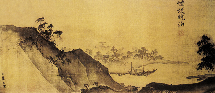 夏圭,字禹玉,钱塘人, 生卒年不详, 略晚于马远, 为南宋宁宗时画院待诏, 擅画山水、人物。《图绘宝鉴》评他:“院人中画山水, 自李唐以下无出其右者也。”为南宋四大家之一。《山水十二景图》为夏氏山水十二景中残存四景中的一部分, 从画面右起分别署有“渔笛清幽”、“烟堤晚泊”二题。图卷从右端出现的是平溪汀渚、湖水荡漾, 渔舟出没。然后是浅滩湖岸、巨石峭壁, 绿树成荫。此画山石用斧劈皴, 先用水笔皴擦, 然后落墨, 具有水墨交融、淋漓酣畅的效果。 |