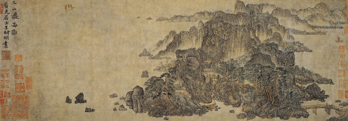 《丹山瀛海图》画东海蓬瀛诸岛壮丽奇伟之景。洲岛环海,水际浩淼,舟樯扬帆远行。岛上山峦重叠,乔松挺立,琼阁楼宇深藏其间,岛屿之间长桥卧波。山石多用解索皴,焦墨点苔,杂树则用夹叶、勾叶、点叶诸法。此图画法细密,景色奇丽,意境开阔。在王蒙作品极为少见。画上自题“丹山瀛海图,香光居士王叔明画”。钤白文“黄鹤山樵”。卷后有明·项元汴题记。