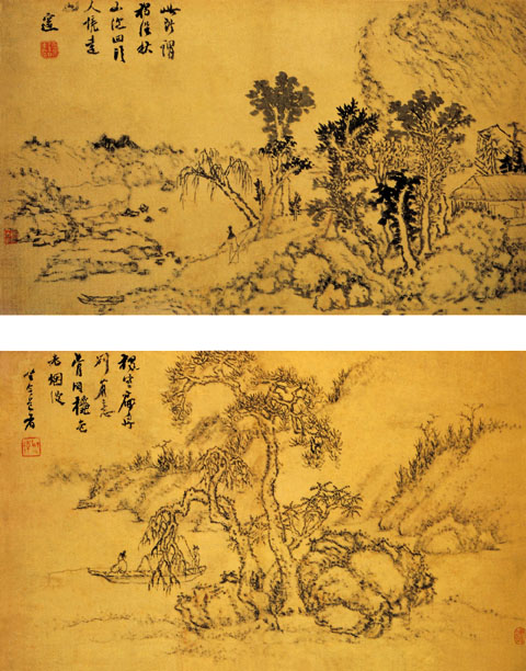 程邃(公元1605—1691),字穆倩,号清溪,又号垢道人,安徽歙县人。山水法巨然,用笔枯瘦,自成一家。此册页共八开,每幅均有题画诗,所画山水宗法王蒙,纯用枯笔焦墨,追求荒朴古茂意境,本为新安画派技法特色,而程邃山水融入金石意味,更为独造。此山水册页,笔精墨妙,立意寄情,深湛品赏,是可贵的佳构。这里所选的两幅作品,墨笔写江南山水景色。画面的构图位置的经营,沿用南宋以来的常见的格局。