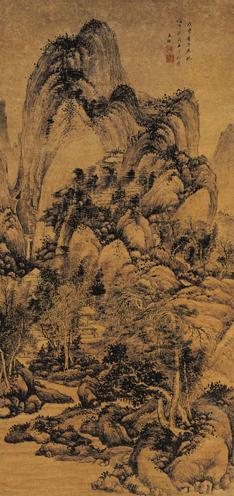 金笺是中国书画用纸的一种,系以黄金或金粉屑铺洒纸面制成,可以使画面产生一种神圣或神秘之气。这件作品是王鉴为奉祝惟老亲翁五十初度而作,画中描绘了一个高山大岭的景色。 画面中央是一伫立的主峰,山岭如游龙一般从峰顶延伸而下。溪水两岸,坡石堆叠,树木丛生。整个山石,形体端庄,气象宏大,主次分明而有序。画中笔法细密雅致,以干笔皴擦造成丰富的画面效果,耐人寻味。