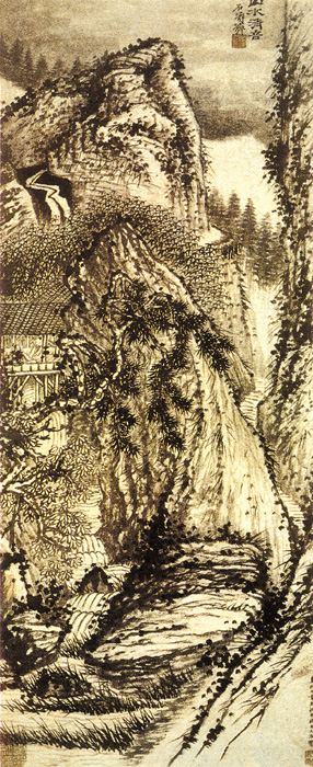石涛的作品一变古人和四王三重四叠之法,以构图新奇见长,在这幅画上原济用了他最擅长的“截取法”,在丛林中截取了幽阁深藏的一段景致,以特写的手法绘出,虽则画的的是一段小景,却传达出一种深邃的意境。元济笔墨画法多变,善于用墨,这幅图上墨气浓重滋润,湿笔较多,通过水墨的渗化和笔墨的融合,使山林的清润深幽被尽致地表现出来。这幅画画了丛林中的一处幽阁,水边坡上有小亭翼然,其下幽篁密布。