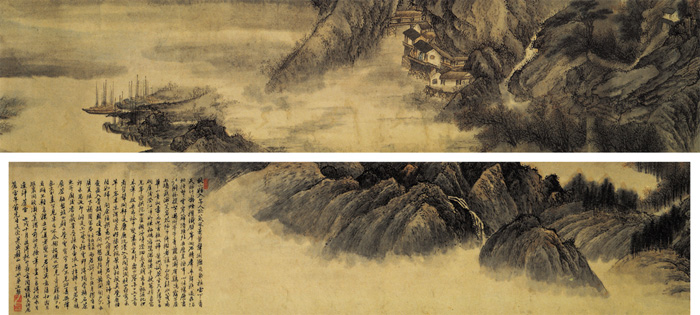 王概(1654—1710), 名丐, 字东郊, 一字安节, 秀水(今浙江嘉兴)人, 寓居南京。善画山水, 师龚贤, 笔法苍健。传世《芥子园画谱》, 共3集, 系王概兄弟3人和其他诸人编绘并加以解说的, 其中山水部分为其手笔。此画写大江岸边群山绵亘逶迤, 幽岩深谷、高峰平坡、流溪飞泉, 杂树密林, 各呈其态, 茅蓬桥梁、舳舻桅樯, 山泉林木均锁于烟云晦明变幻之中。此画以干笔勾勒皴擦, 淡墨渲染, 浅绛设色, 得山石形理, 而能氤氲成气。卷后自题长诗, 有“秋山喜各末草草, 客来亦谓此卷好”句, 知为作者得意佳作。 |