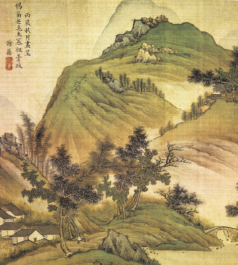 谢荪存世作品不多,此幅《山水图》从画法看,多吴门文徵明派系遗意。山势嵯峨,垒石嶙峋,景致奇险,用笔细秀,工中带拙,短披麻、点子皴而轻,苔点疏而淡;设色青绿间以浅绛,绚丽中见清雅,风格接近“吴派”陆治影响,工细秀丽。