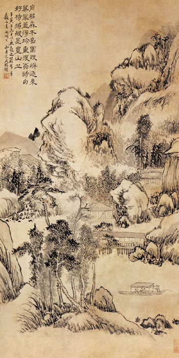 高翔(1688—1753),字夙冈,号西唐,又作犀堂、西堂等。别号山林外臣,擅画山水花卉,间作佛像人物。篆刻与汪士慎、丁敬齐名。又与高凤翰、潘西凤、沈凤并称“四凤”。 高翔少年时期崇尚石涛,后与石涛结识为友,常相往来,情谊深长,受益颇深。画面构图简洁明晰,院落和房舍散布,古树参天,江中一渡船,船上人物以最简洁的笔调勾成,不能再减少一笔,而人的动态已被表现得十分清晰,作者功力由此可见。