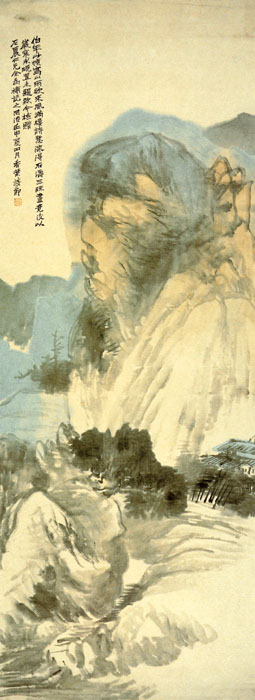 “海派”就是指清末集中在上海出售自己艺术品,其画作符合新兴城市阶层欣赏口味的一批画家。他们虽然生平经历各不相同,为了适应艺术品市场,高雅的文人趣味逐渐减少,在表现手法上尽量采用更适于被民众接受的方式。此画似乎有些模糊不清,前景山石淡墨为之,唯山石后的树叶一片黑色,屋舍被右倾的树丛掩盖。整个画面给人气势渐大,大雨将临之感。画上题跋:“伯年此祯写山雨欲来风满楼诗意,深得石涛三昧……”