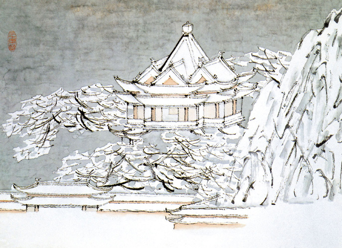 这是虚谷《山水册》中的一幅,名为古殿银妆。其他分别为茂林修竹,林舍初曙、云屋积翠、柳屋著书、篱宅桑枝、古刹梵音、秋林逸士、叶荫消闲、孤蒲远眺、碧湖缓舟、初寒流篁等12幅,景物主题集中,境界清静,意绪畅达,富有诗情画意。画中钤有“虚谷”,“三十七峰草堂”诸印。其中《古殿银妆》用色清淡,笔意阑珊,很有几分匆匆而就的感觉。画面却显得轻灵悠远。