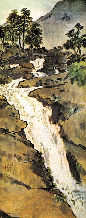 陈树人(1883-1948),近代画家,广东番禺人。17岁时从居廉学画。后赴日本,进京都美术学校及日本大学文科学习绘画和文学。擅山水花卉,画风秀丽,与高剑父、高奇峰并称为岭南现代三大家。玉渊,水深之处,美玉出产地。画家所画可能是三峡的玉渊潭。在构图用色上很有特色。显然得益于西洋画的水彩影响,但薄而不轻,淡而厚重,雅而不俗,清丽而不浮艳,展现出深远旷阔,有意在画外之感。