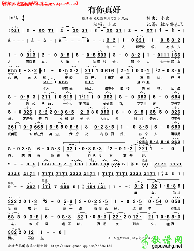 《有你真好》歌曲由小虫填词,小虫谱曲,小虫演唱,是电视剧《天涯明月刀》的片尾曲。