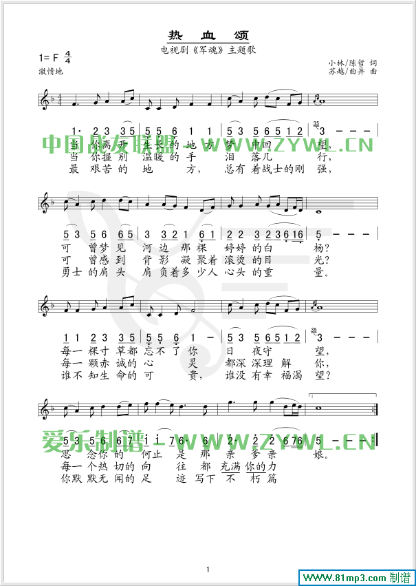 热血颂 线、简谱混排版