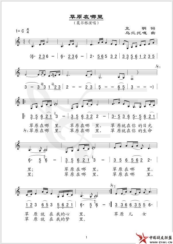 草原在哪里 线、简谱混排版