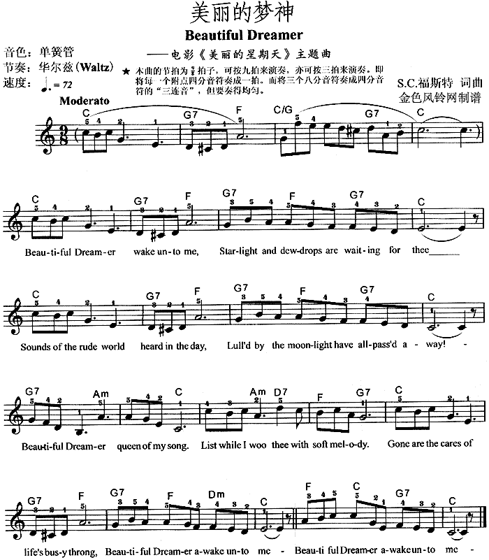 美丽的梦神 Beautiful Dreamer(《美丽的星期天》主题曲)[电子琴谱]