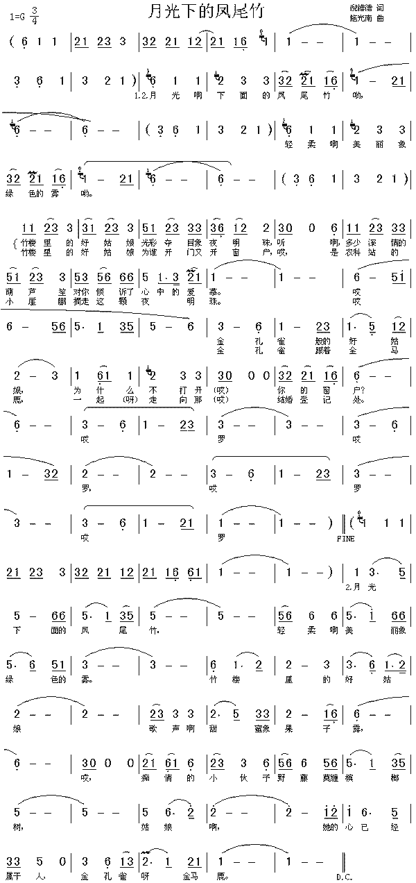 月光啊下面的凤尾竹哟 轻柔啊美丽像绿色的雾哟 竹楼里的好姑娘 光彩夺目像夜明珠听啊 多少深情的葫芦笙 对你倾诉着心中的爱慕 哎金孔雀般的好姑娘 为什么不打开哎你的窗户 月光下的凤尾竹 轻柔啊美丽像绿色的雾哟 竹楼里的好姑娘 歌声啊甜润像果子露 痴情的小伙子 野藤莫缠槟榔树 姑娘啊我的心已经属于人 金孔雀要配金马鹿 月光下的凤尾竹 轻柔啊美丽像绿色的雾哟 竹楼里的好姑娘 为谁敞开门又开窗户 哦是农科站的小岩鹏 摘走这颗夜明珠哎 金孔雀跟着金马鹿 一起啊走向那绿色的雾哎 |