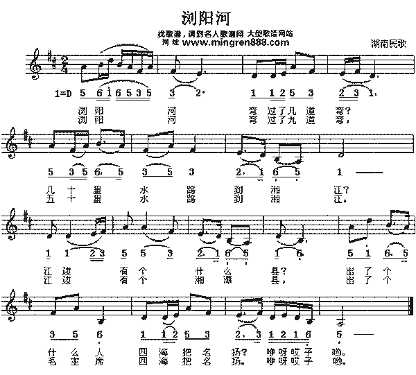 | 浏阳河 弯过了几道弯 几十里水路到湘江 江边有个什么县哪 出了个什么人 领导人民得解放 啊依呀依子哟 浏阳河 弯过了九道弯 五十里水路到湘江 江边有个湘潭县哪 出了个毛主席 领导人民得解放 啊依呀依子哟 music 浏阳河 弯过了九道弯 五十里水路到湘江 江水滔滔流不断哪 比不过毛主席恩情长 啊依呀依子哟 毛主席 象太阳 他指引着人民 前进的方向 我们永远跟着毛主席哎 人民的江山万年长 啊依呀依子哟 浏阳河 湾又长 两岸的客车向四方 幸福歌儿唱不尽啊 歌唱敬爱的毛主席 我们心中的红太阳 啊依呀依子哟 歌唱敬爱的毛主席 我们心中的红太阳 红太阳 |