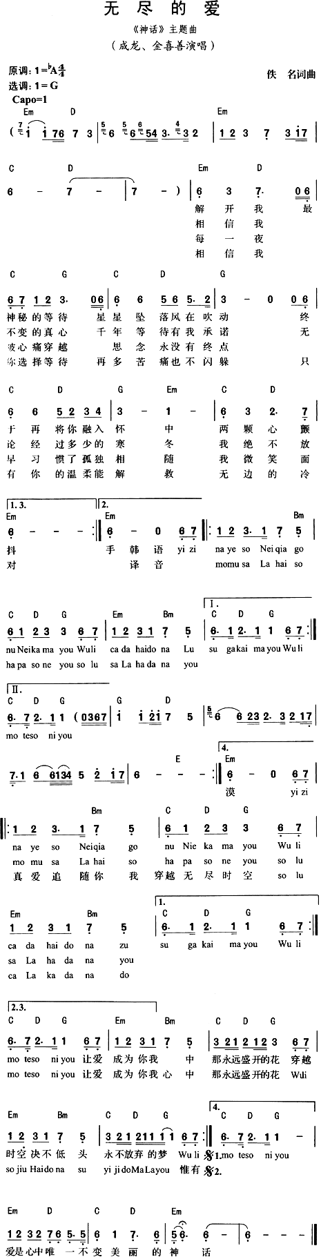 成龙/金喜善 成:解开我最神秘的等待 星星坠落风在吹动 终于再将你拥入怀中 两颗心颤抖 相信我不变的真心 千年等待有我承诺 无论经过多少的寒冬 我决不放手 (韩)金:现在紧抓住我的手闭上眼睛 请你回想起过去我们恋爱的日子 我们是因为太爱 所以更使得我们痛苦 我们连"爱你"这句话都无法讲 成:每一夜被心痛穿越 思念永没有终点 早习惯了孤独像随 我微笑面对 相信我我选择等待 再多苦痛也不闪躲 只有你的温柔能解救 无边的冷漠 (韩)金:现在紧抓住我的手闭上眼睛 请你回想起过去我们恋爱的日子 我们是因为太爱 所以更使得我们痛苦 我们连"爱你"这句话都无法讲 合:让爱成为你我心中 那永远盛开的花 穿越时空绝不低头永不放弃的梦 我们是因为太爱 所以更使得我们痛苦 我们连"爱你"这句话都无法讲 让爱成为你我心中 那永远盛开的花 我们千万不要忘记我们的约定 唯有真爱追随你我 穿越无尽时空 我们连"爱你"这句话都无法讲 成:爱是心中唯一不变美丽的神话 |