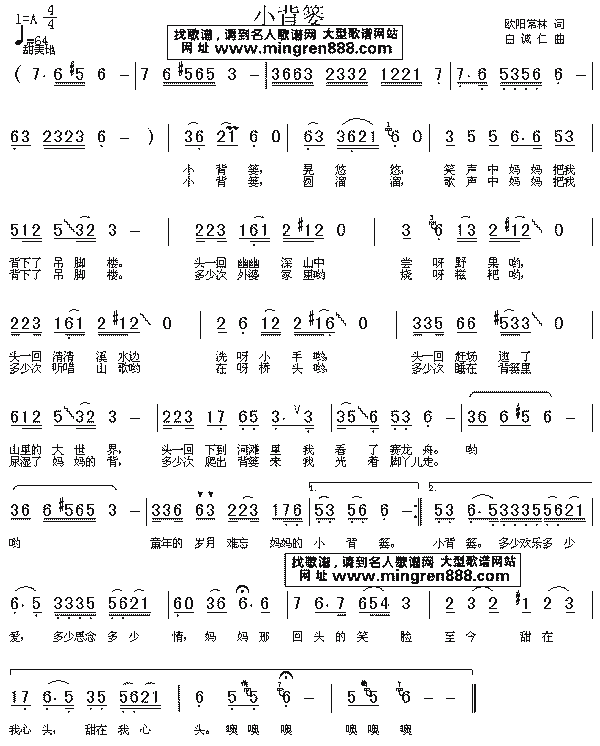 | 作词:欧阳常林作曲:白诚仁 小背篓晃悠悠 笑声中妈妈把我背下了吊脚楼 头一回幽幽深山中尝野果哟 头一回清清溪水边洗小手哟 头一回赶场逛了山里的大世界 头一回下到河滩里我看了赛龙舟 哟啊啊--哟啊啊 童年的岁月难忘妈妈的小背篓 小背篓圆溜溜 歌声中妈妈把我背下了吊脚楼 多少次外婆家里哟烧呀糍粑哟 多少次听唱山歌哟在呀桥头哟 多少次睡在背篓里尿湿了妈妈的背 多少次爬出背篓来我光着脚丫走 哟啊啊--哟啊啊 童年的岁月难忘妈妈的小背篓 多少欢乐多少爱 多少思念多少情 妈妈那回头的笑脸至今甜在我心头 甜在我心头 啊--啊--啊 |