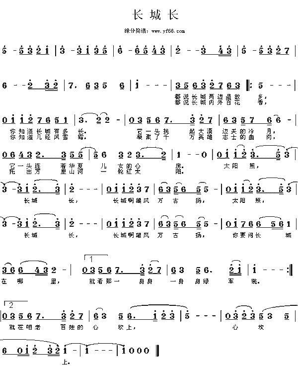 | 词:净肃曲:孟庆云 都说长城两边是故乡 你知道长城有多长? 它一头挑起大漠边关的冷月 它一头连着华夏儿女的心房 都说长城内外百花香 你知道几经风雪霜? 凝聚了千万英雄志士的血肉 博出万里山河一轮红太阳 太阳照长城长 长城他雄风万古扬 太阳照长城长 长城他雄风万古扬 你要问长城在哪里 就看那一身身一身身绿军装 music 都说长城两边是故乡 你知道长城有多长? 它一头挑起大漠边关的冷月 它一头连着华夏儿女的心房 都说长城内外百花香 你知道几经风雪霜? 凝聚了千万英雄志士的血肉 博出万里山河一轮红太阳 太阳照长城长 长城他雄风万古扬 太阳照长城长 长城他雄风万古扬 你要问长城在哪里 就在咱老百姓的心坎上心坎上 |