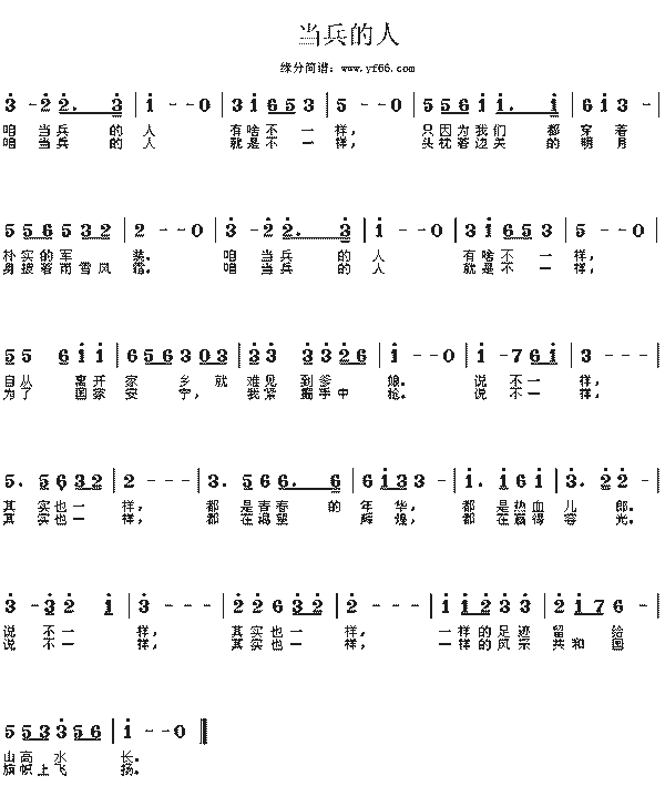| 咱当兵的人, 有啥不一样, 只因为我们都穿着, 朴实的军装. 咱当兵的人, 有啥不一样, 自从离开家乡, 就难见到爹娘. 说不一样其实也一样, 都是青春的年华, 都是热血儿郎. 说不一样其实也一样, 一样的足迹, 留给山高水长. 咱当兵的人,就是不一样, 头枕着边关的冷月, 身披着雪雨风霜 咱当兵的人, 就是不一样, 为了国家安宁, 我们紧握手中枪. 说不一样其实也一样, 都在渴望辉煌, 都在赢得荣光. 说不一样其实也一样, 一样的风采在共和国, 旗帜上飞扬. 咱当兵的人, 就是这个样. |