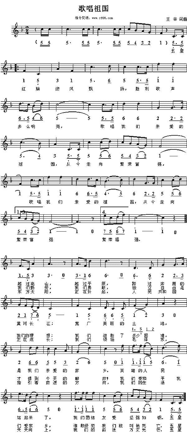 | 五星红旗迎风飘扬, 胜利歌声多么响亮; 歌唱我们亲爱的祖国, 从今走向繁荣富强. 歌唱我们亲爱的祖国, 从今走向繁荣富强. 越过高山,越过平原, 跨过奔腾的黄河长江; 宽广美丽的土地, 是我们亲爱的家乡, 英雄的人民站起来了! 我们团结友爱坚强如钢. 五星红旗迎风飘扬, 胜利歌声多么响亮; 歌唱我们亲爱的祖国, 从今走向繁荣富强. 歌唱我们亲爱的祖国, 从今走向繁荣富强 我们勤劳,我们勇敢, 独立自由是我们的理想; 我们战胜了多少苦难, 才得到今天的解放! 我们爱和平,我们爱家乡, 谁敢侵犯我们就叫他死亡! 五星红旗迎风飘扬, 胜利歌声多么响亮, 歌唱我们亲爱的祖国, 从今走向繁荣富强. 歌唱我们亲爱的祖国, 从今走向繁荣富强. 东方太阳,正在升起, 人民共和国正在成长; 我们领袖毛泽东, 指引着前进的方向. 我们的生活天天向上, 我们的前途万丈光芒. 五星红旗迎风飘扬, 胜利歌声多么响亮; 歌唱我们亲爱的祖国, 从今走向繁荣富强. 歌唱我们亲爱的祖国, 从今走向繁荣富强. |