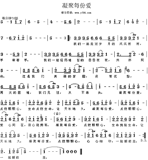 凝聚每份爱 我们一起走过 岁月的风风雨雨, 手牵着手, 我们一起经历难忘 的日日夜夜,共济同舟. 这是我们美丽的家园, 没有忧愁, 再大的困难我们见过, 从不低头. 凝聚每份爱,点燃颗颗心, 生命挽起生命让天长地久, 凝聚每份爱,点燃颗颗心, 爱心同在,信心就拥有. 凝聚每份爱,点燃颗颗心, 生命挽起生命让天长地久, 凝聚每份爱,点燃颗颗心, 心心相印,一起朝前走. 我们一起走过岁月的 风风雨雨,手牵着手, 我们一起经历难忘的 日日夜夜,共济同舟. 这是我们美丽的家园, 没有忧愁, 再大的困难我们见过, 从不低头. 凝聚每份爱,点燃颗颗心, 生命挽起生命让天长地久, 凝聚每份爱,点燃颗颗心, 爱心同在,信心就拥有. 凝聚每份爱,点燃颗颗心, 生命挽起生命让天长地久, 凝聚每份爱,点燃颗颗心, 心心相印,一起朝前走. 凝聚每份爱,点燃颗颗心, 生命挽起生命让天长地久, 凝聚每份爱,点燃颗颗心, 心心相印,一起朝前走. 一起朝前走. |