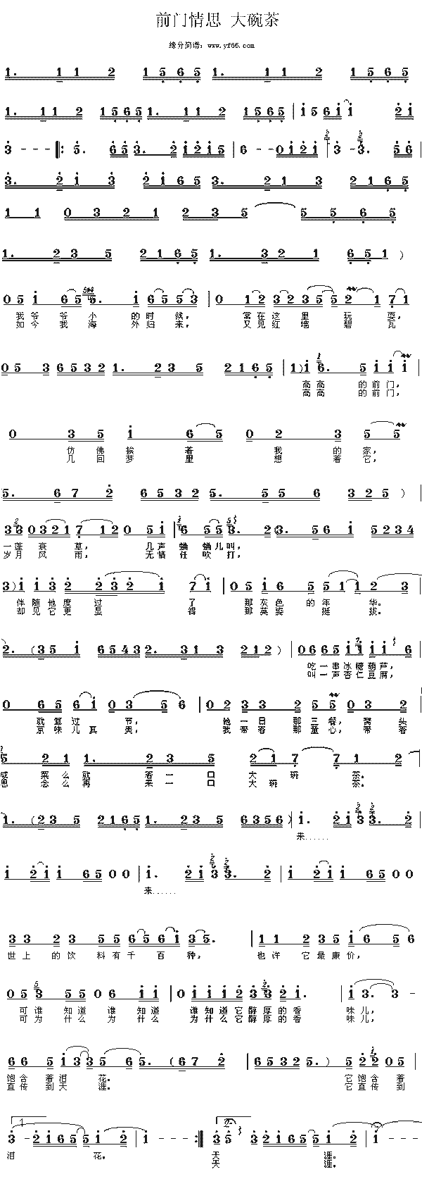 我爷爷小的时候, 常在这里玩耍, 高高的前门, 仿佛挨着我的家, 一蓬衰草, 几声蛐蛐儿叫, 伴随他度过了那灰色的年华. 吃一串儿冰糖葫芦就算过节, 他一日那三餐, 窝头咸菜么就着一口大碗儿茶. 啦······, 世上的饮料有千百种, 也许它最廉价, 可谁知道, 谁知道, 谁知道它醇厚的香味儿, 饱含着泪花, 它饱含着泪花. 如今我海外归来, 又见红墙碧瓦, 高高的前门, 几回梦里想着它, 岁月风雨, 无情任吹打, 却见它更显得那英姿挺拔. 叫一声杏仁儿豆腐, 京味儿真美, 我带着那童心, 带着思念么再来一口大碗儿茶. 啦······, 世上的饮料有千百种, 也许它最廉价, 可为什么, 为什么, 为什么它醇厚的香味儿, 直传到天涯, 它直传到天涯. |