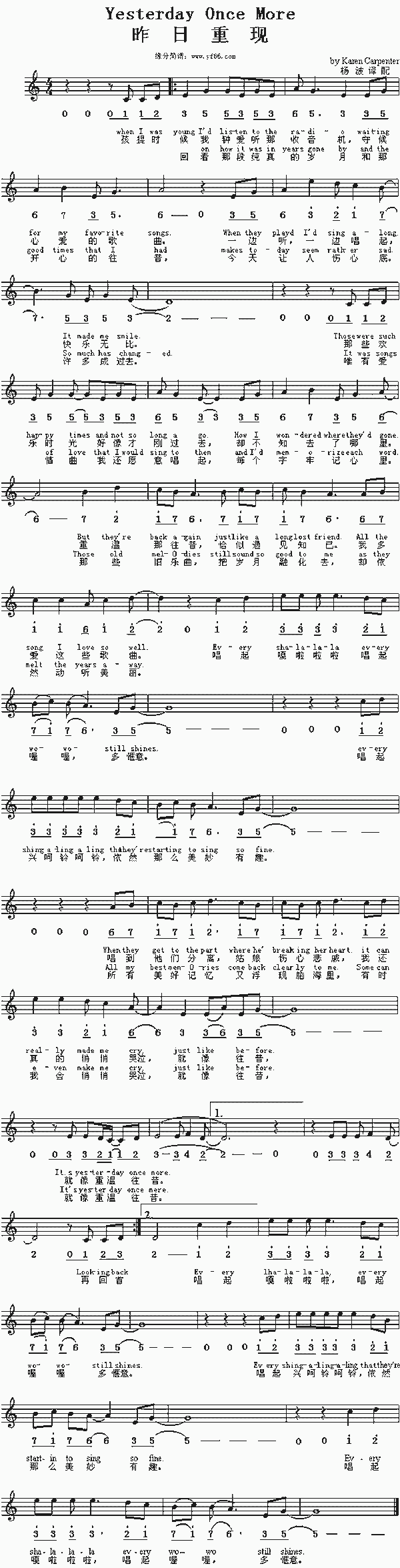 Yesterday Once More When I was young I'd listen to the radio Waiting for my favorite songs When they played I'd sing along, It make me smile. Those were such happy times and not so long ago How I wondered where they'd gone. But they're back again just like a long lost friend All the songs I love so well. Every shalala every wo'wo still shines. Every shing-a-ling-a-ling that they're starting to sing so fine When they get to the part where he's breaking her heart It can really make me cry just like before. It's yesterday once more. (Shoobie do lang lang) Looking bak on how it was in years gone by And the good times that had makes today seem rather sad, So much has changed. It was songs of love that I would sing to them And I'd memorise each word. Those old melodies still sound so good to me As they melt the years away Every shalala every wo'wo still shines Every shing-a-ling-a-ling that they're startingTo sing so fine All my best memorise come back clearly to me Some can even make me cry just like before. It's yesterday once more. (Shoobie do lang lang) Every shalala every wo'wo still shines. Every shing-a-ling-a-ling that they're starting to sing so fine Every shalala every wo'wo still shines. Every shing-a-ling-a-ling that they're starting to sing so fine |