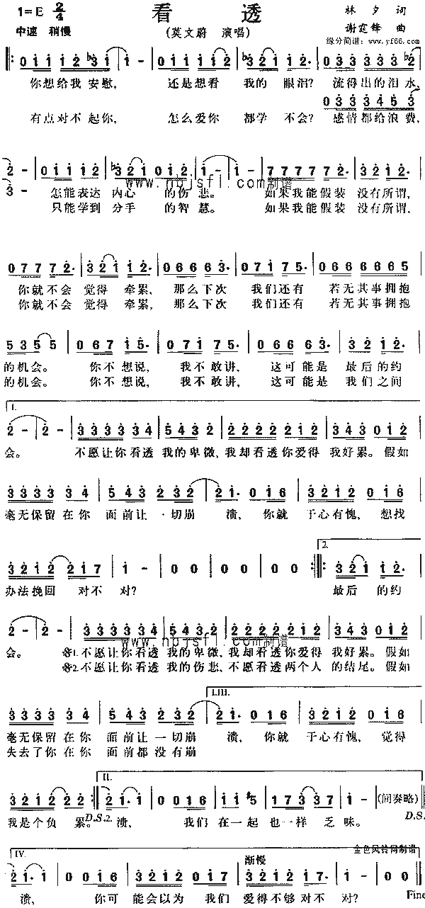 你想给我安慰还是想看我的眼泪 流得出的泪水怎能表达你心的伤悲 如果我能假装没有所谓 你就不会觉得牵累 那么下次我们还有 若无其事拥抱的机会 你不想说我不敢讲 这可能是最后的约会 不愿让你看透我的卑微 我却看透你爱得我好累 假如毫无保留在你面前让一切崩溃 你就于心有愧 想找办法挽回对不对 有点对不起你这么爱你都学不会 感情到底浪费只能学到分手的智慧 如果我能假装没有所谓 你就不会觉得牵累 那么下次我们还有 若无其事拥抱的机会 你不想说我不敢讲 这可能是我们之间最后的约会 不愿让你看透我的卑微 我却看透你爱得我好累 假如毫无保留在你面前让一切崩溃 你就于心有愧 觉得我是个负累 不愿让你看透我的伤悲 不愿看透两个人的结尾 假如失去了你在你面前都没有崩溃 我们在一起也一样乏味 不愿让你看透我的卑微 我却看透你爱得我好累 假如毫无保留在你面前让一切崩溃 你就于心有愧 觉得我是个负累 不愿让你看透我的伤悲 不愿看透两个人的结尾 假如失去了你在你面前都没有崩溃 你可能会以为我们爱得不够对不对 ~~~莫文蔚看透~~~ |