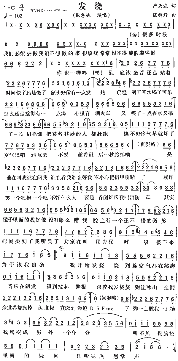 | os:很多时候我们必须去做我我们不想做的事很烦 我常常恨不得能假装昏倒你也一样吗? 到底该坐著还是站著时钟快了还是慢了 额头好像有一点发热 已经喝了开水喝了可乐 怎么还是觉得有一点渴 心里有辆火车 又喷了一点香水又描了一次眉毛 有谁把莫名其妙的人都赶跑 搞不好冷气早就坏了空气很糟 到底要不要趁著最后一秒跑掉噢 是谁在叫我谁在问我 谁在看我谁在等我 不小心把指甲咬断了 或许笑一个吧抱一个吧 不管什么人 要是昏倒谁帮我叫消防车 其实镜子里面的我好像没有那么糟 我脸上有一个还不错的微笑 时间要到了我听到了大家在叫 用力深呼吸接下来终于该我出场 我开始发烧烧到连空气都在跳脚 音乐在发飙飙到拉起警报 跟著我发烧烧到让冰山全倒 全世界都疯掉从北极一直烧到赤道 os:游戏开始了每一个人都要准备当主角 要上了就什么都别想用力把电源按下去就对了 把那个台上的人当作是别人就好啰 子弹一上膛我一上场 我就变成另外一个分身 听不见我脑袋里面的疑问 只听见热烈掌声 |