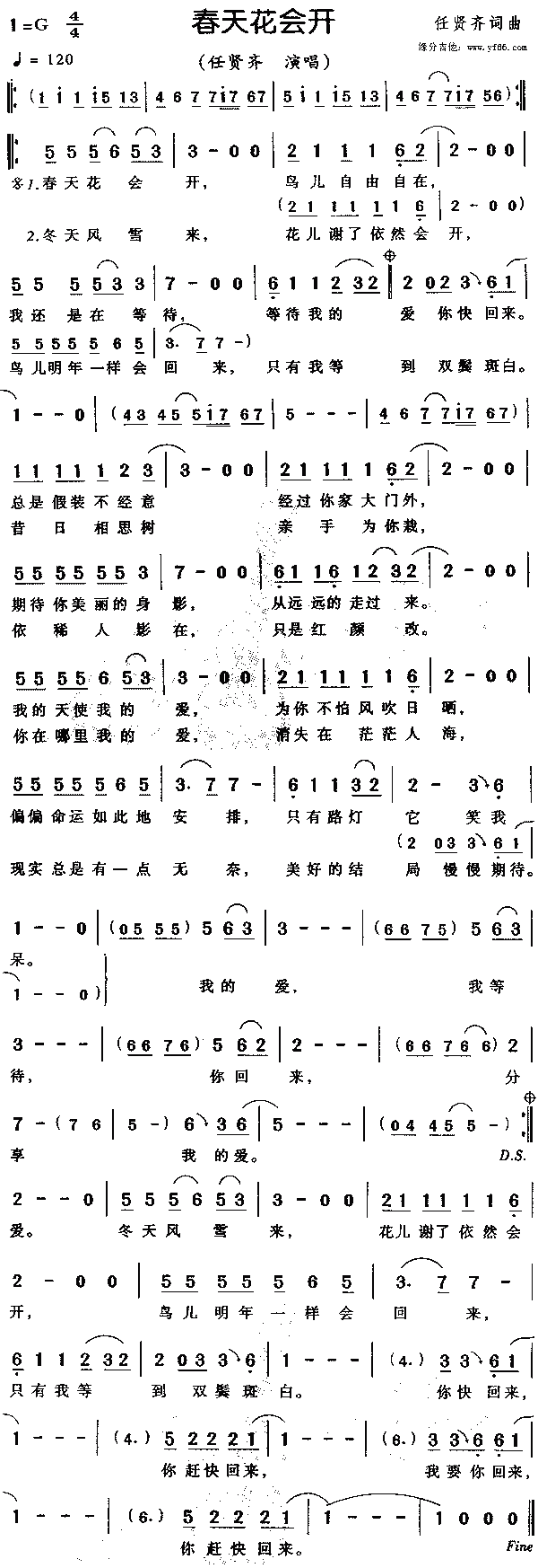 春天花会开 鸟儿自由自在 我还是在等待 等待我的爱 你快回来(你赶快回来) 总是假装不经意 经过你家大门外 期待你美丽的身影 从远远的走过来 我的天使我的爱 为你不怕风吹日晒 偏偏命运如此的安排 只有路灯它笑我呆 我的爱我等待 你回来分享我的爱 冬天风雪来 花儿谢了依然会开 鸟儿明年一样会回来 只有我等到双鬓斑白 昔日相思树 亲手为你栽 依稀人影在 只是红颜改 你在那里我的爱 消失在茫茫人海 现实总是有一点无奈 美好的结局慢慢期待 我的爱我等待 你回来分享我的爱 春天花会开 鸟儿自由自在 我还是在等待 等待我的爱 冬天风雪来 花儿谢了依然会开 鸟儿明年一样会回来 只有我等到双鬓斑白(春天花会开) 你快回来(鸟儿自由自在) 你赶快回来(冬天风雪来) 我要你回来(我还是在等待) 你赶快回来 |