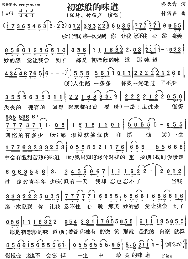 (女)当我第一次见到你 让我忍不住心跳 那美妙的感觉让我尝到了 那是初恋般的味道的味道 (男)人生路一条条 你我一起走过了不少 失去的拥有的 回想起来都很重要 (女)一路上走过来 值得回忆的有多少 那浪漫幻想忧伤和烦恼 (男)一生中会有酸甜苦辣的味道 (女)我只知道缘分对我的重要 (男)我们慢慢走过走过青春年少 (女)但有一天我却忘也忘不了 当我第一次见到你 让我忍不住心跳 那美妙的感觉让我尝到了 那是初恋般的味道 (男)看着你独有的微笑 那就是我的自豪 就算慢慢变老也不会忘掉 一生中最美的味道 |