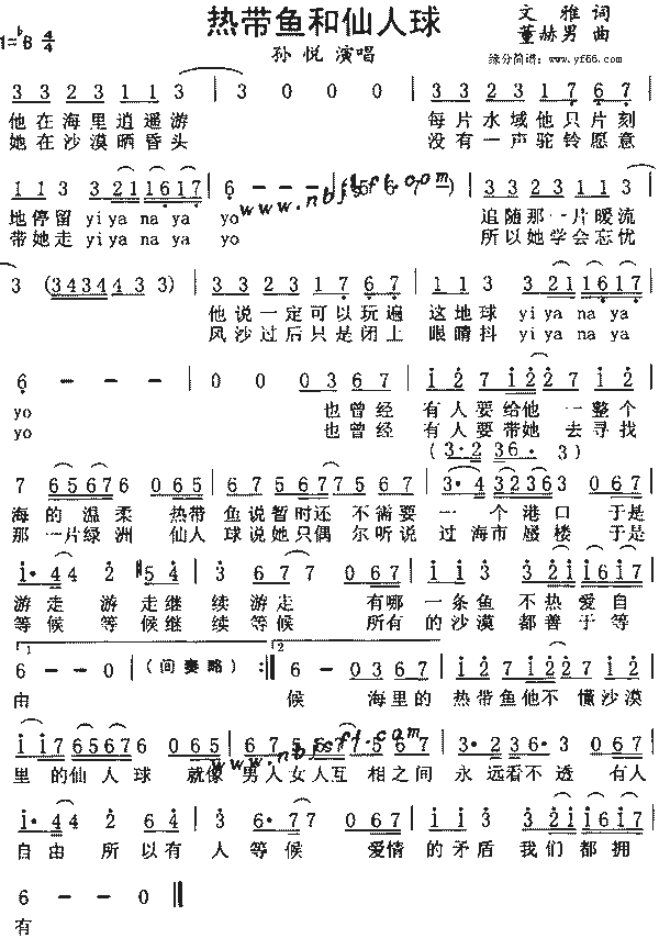 他在海里逍遥游每片水域他只片刻的停留 yi-ya-na-ya-you 追随那一股暖流他说一定可以玩遍这地球 yi-ya-na-ya-you 也曾经有人要给他一整个海的温柔 热带鱼说暂时还不需要一个港口 于是游走游走继续游走 有哪一条鱼不热爱自由 她在沙漠晒昏头没有一声驼铃愿意带她走 yi-ya-na-ya-you 所以她学会忘忧风沙过后只是闭上眼睛抖 yi-ya-na-ya-you 也曾经有人要带她去寻找那一个绿洲 仙人球说她只偶尔听说过海市蜃楼 于是等候等候继续等候 所有的沙漠都擅于等候 海里的热带鱼他不懂沙漠里的仙人球 就象男人女人互相之间永远看不透 有人自由所以有人等候 爱情的矛盾我们都拥有 |