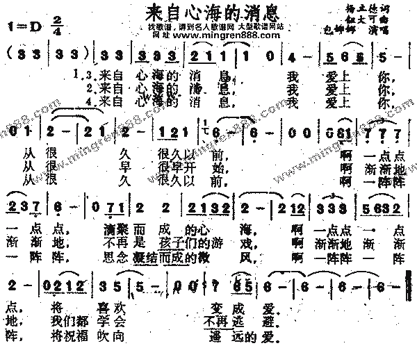 来自心海的消息 演唱:包娜娜词:杨立德曲:钮大可 来自心海的消息我爱上你 从很久很久以前 啊一点点一点点 滴聚而成的心海 啊一点点一点点 将喜欢变成爱 来自心海的消息我爱上你 从很早很早开始 啊渐渐的渐渐的 不再是孩子们的游戏 啊渐渐的渐渐的 我们都学会不再逃避 来自心海的消息我爱上你 从很久很久以前 啊一点点一点点 滴聚而成的心海 啊一点点一点点 将喜欢变成爱 来自心海的消息我爱上你 从很久很久以前 啊一阵阵一阵阵 思念凝结而成的微风 啊一阵阵一阵阵 将祝福吹向遥远的你 来自心海的消息我爱上你 从很久很久以前 啊一点点一点点 滴聚而成的心海 啊一点点一点点 将喜欢变成爱 来自心海的消息我爱上你 从很早很早开始 啊...... |