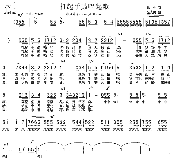 刀郎:打起手鼓唱起歌 打起手鼓唱起歌,我骑着马儿翻山坡. 千里牧场牛羊壮,丰收的庄稼闪金光. 我的手鼓纵情唱,欢乐的歌声震山河. 草原盛开幸福花,花开千万朵! 打起手鼓唱起歌,我骑着马儿跨江河. 歌声溶进泉水里,流的家乡遍地歌. 我的手鼓纵情唱,唱不尽美好的新生活. 站在草原望北京,越唱歌越多! 来.....来..... 打起手鼓唱起歌,我唱的豪气红似火. 各族人民跟着党,社会主义道路多宽阔. 我的手鼓纵情唱,毛主席的光辉暖心窝. 红日永远照边疆,歌声永不落! 来.....来..... |