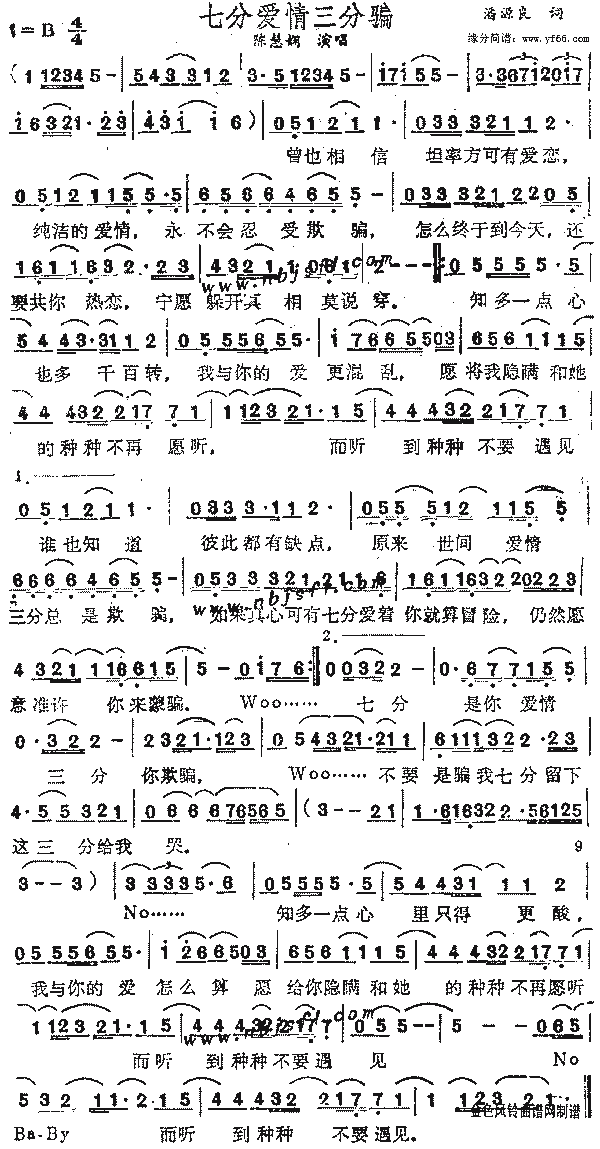 作词:潘源良作曲:d.warren 编曲:杜自持 曾也相信坦率方可有爱恋 纯洁的爱情永不会忍受欺骗 怎么终于到今天还要共你热恋 宁愿躲开真相莫说穿 知多一点心也多千百转 我与你的爱更混乱 愿将我隐瞒 和她的种种不再愿听 而听到种种不要遇见 谁也知道彼此都有缺点 原来世间爱情三分总是欺骗 如果真心可有七分爱着你就算冒险 仍然愿意准许你来瞒骗 七分是你爱情 三分你欺骗 oh 不要是骗我七分 留下这三分给我哭 woo... no no no 知多一点心里只得更酸 我与你的爱怎么算 愿给你隐瞒 和她的种种不再愿听 而听到种种不要遇见 |