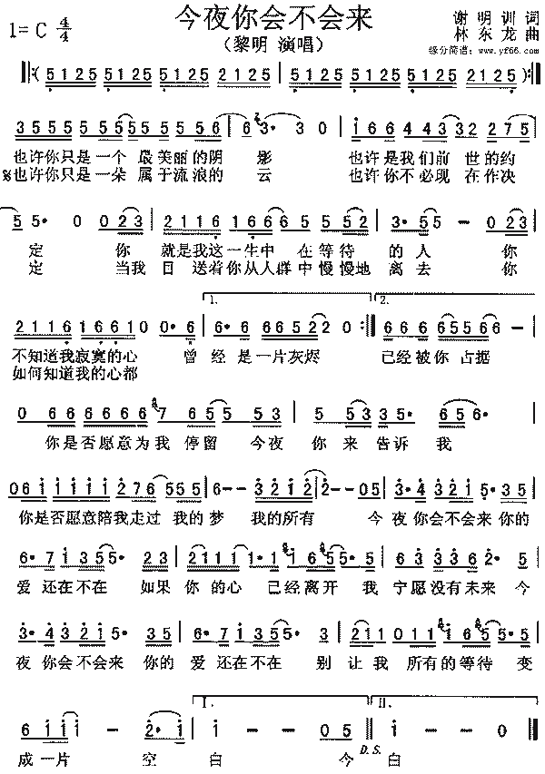 今夜你会不会来 作词:简宁 作曲:林东松 谢明训 编曲:王豫民 或许匆匆一生中要与你相聚 相识非偶然茫茫人海里 虽知道某日你或许会弃我而别去 总想永远地爱着你 弥补彼此心中距离 习惯了每晚要吻过你再去安睡 当天的那段誓言长留心里 此刻却吻别你人海里悄悄然离别我 可知道我为你难过 情不必解释太多 与你爱过永远感激心里愿爱意尽记取 盼再与你抱紧每段承诺一起再追 今夜你会不会来 你的爱还在不在 假使失去你谁要未来 谁愿芳心离开 今夜你会不会来 你的爱还在不在 只想拥有你同渡未来 陪伴着我相爱 习惯了每晚要吻过你再去安睡 当天的那段誓言长留心里 此刻却吻别你人海里悄悄然离别我 可知道我为你难过 情不必解释太多 与你爱过永远感激心里愿爱意尽记取 盼再与你抱紧每段承诺一起再追 今夜你会不会来 你的爱还在不在 假使失去你谁要未来 谁愿芳心离开 今夜你会不会来 你的爱还在不在 只想拥有你同渡未来 陪伴着我相爱 今夜你会不会来 你的爱还在不在 假使失去你谁要未来 谁愿芳心离开 今夜你会不会来 你的爱还在不在 只想拥有你同渡未来 |