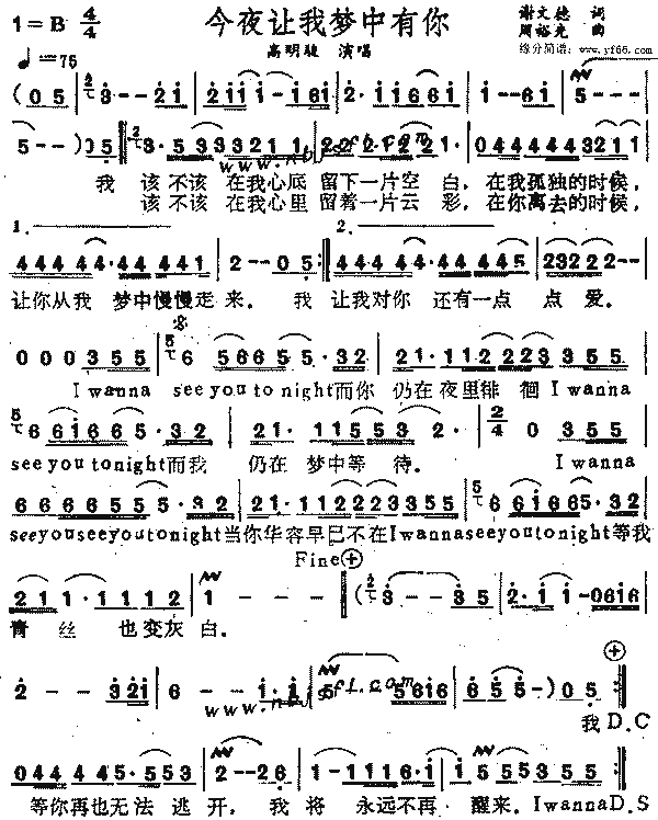 歌曲:今夜让我梦中有你 演唱:高明骏 我该不该 在我心里留下一片空白 在我孤独的时候 让你从我梦中慢慢走来 我该不该 在我心里留着一片云彩 在你离去的时候 让我对你还有一点点爱 i wanna see you tonight 而你仍在夜里徘徊 i wanna see you tonight 而我仍在梦中等待 i wanna see you tonight 当你欢容早已不在 i wanna see you tonight 等我青丝也变灰白 等你再也无法逃开 我将永远不再醒来 |