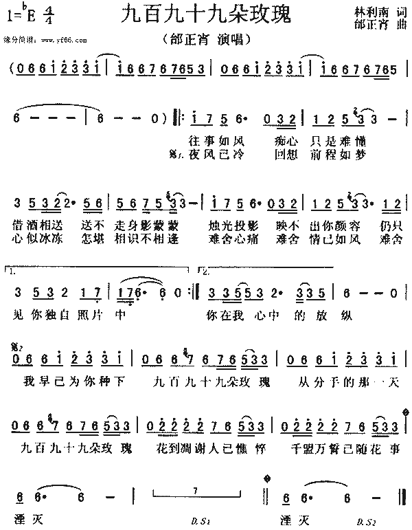 往事如风,痴心只是难懂 借酒相送,送不走身影蒙蒙 烛光投影,映不出你颜容 仍只见你独自照片中 夜风已冷,回想前程如梦 心似云动,怎堪相识不相逢 难舍心痛,难舍情已如风 难舍你在我心中的芳踪 我早已为你种下 九百九十九朵玫瑰 从分手的那一天, 九百九十九朵玫瑰 花到凋谢人已憔悴 千盟万誓已随花逝湮灭 夜风已冷,回想前程如梦 心似云动,怎堪相识不相逢 难舍心痛,难舍情已如风 难舍你在我心中的芳踪 我早已为你种下 九百九十九朵玫瑰 从分手的那一天, 九百九十九朵玫瑰 花到凋谢人已憔悴 千盟万誓已随花逝湮灭 |