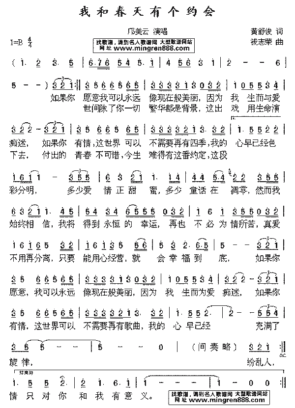 我和春天有个约会 如果你愿意 我可以永远像现在这般美丽 因为我生而为爱痴迷 如果你有情 这世界可以不需要再有四季 我的心早已经色彩分明 多少爱情正甜蜜 多少童话在凋零 然而我始终相信 我将得到永恒的幸运 再也不必为情所苦 真爱不用再分离 只要能用心经营 就会幸福到底 如果你愿意 我可以永远像现在这般美丽 因为我生而为爱痴迷 如果你有情 这世界可以不需要再有歌曲 我的心早已经充满了旋律 纷乱人世间 除了你一切繁华都是背景 这出戏用生命演下去 付出的青春不可惜 今生难得有这番约定 这段情只对你和我有意义 不管这世界阴晴圆缺 只愿和春天有个约会 i have date with spring |