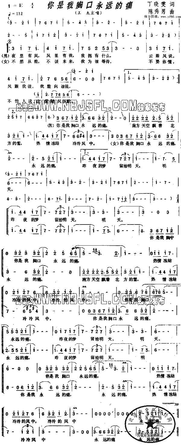 你是我胸口永远的痛 作曲:陈秀男 作词:丁晓雯 演唱:王杰 男:夜里有风 风里有我 我拥有什么 云跟风说 风跟我说 我能向谁说 女:不想从前 不谈未来 我为谁等待 不要你懂 不怕人说 让爱随风沉默 男:你是我胸口永远的痛 南方天空飘着北方的雪 热情冻结冷冷风中 女:你是我胸口永远的痛 永远的痛 昨夜的梦 留给明天明天 (music) 男:你是我胸口永远的痛 南方天空飘着北方的雪 女:热情冻结冷冷风中 男:你是我胸口永远的痛 女:永远的痛 合:昨夜的梦 留给明天明天 男 女:你是我胸口永远的痛 男:南方天空飘着北方的雪 男 女:热情冻结冷冷风中 男:你是我胸口永远的痛(女:永远的痛) 男 女:永远的痛 昨夜的梦 留给明天明天 男:你是我永远的痛(女:你是我) 女:永远的痛 男 女:永远的痛 热情冻结 冷冷风中(女:冷冷的风中)... |