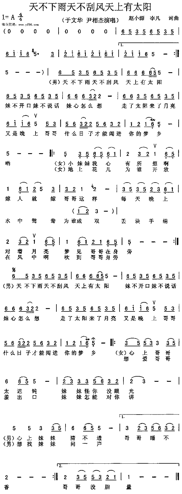 天不下雨天不刮风天上有太阳 于文华;尹相杰 词:赵小源;曲:李凡 男:天不下雨天不刮风天上有太阳 妹不开口妹不说话妹心怎么想 走了太阳来了月亮又是晚上 哥哥什么日子才能闯进你的梦乡 女:小妹妹我心有所想 俺嫁人就嫁哥哥这样 每天晚上对着月亮 梦见哥哥在身旁 地上花儿为谁开放 水中鸳鸯为谁成双 丢块手绢在风中 风吹到哥哥身旁 男:天不下雨天不刮风天上有太阳 妹不开口妹不说话妹心怎么想 走了太阳来了月亮又是晚上 哥哥什么日子才能闯进你的梦乡 女:心上哥哥太迟钝妹妹怪你没眼光 男:心上妹妹猜不透哥哥睡不香 女:想爱哥哥羞出口妹妹怎能对你讲 男:想找妹妹问一声哥哥没胆量 男:天不下雨天不刮风天上有太阳 妹不开口妹不说话妹心怎么想 走了太阳来了月亮又是晚上 哥哥什么日子才能闯进乡你的梦 |