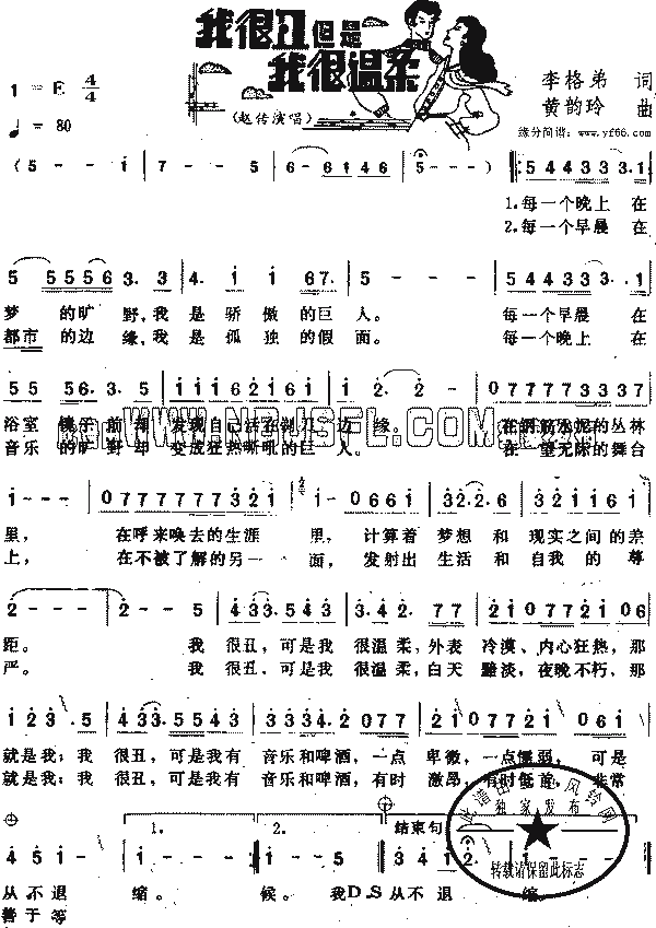 我很丑,可是我很温柔(节奏版) 赵传 词:李格弟曲:黄韵玲 每一个晚上 在梦的旷野 我是骄傲的巨人 每一个早晨 在浴室的镜子前 却发现自己活在剃刀边缘 在钢筋水泥的丛林里 在呼来唤去的生涯里 计算着梦想和现实之间的差距 我很丑可是我很温柔 外表冷漠内心狂热 那就是我 我很丑可是我有音乐和啤酒 一点卑微一点懦弱 可是从不退缩 每一个早晨 在都市的边缘 我是孤独的假面 每一个晚上 在音乐的旷野 却变成狂热嘶吼的巨人 在一望无际舞台上 在不被了解另一面 发射出生活和自我的尊严 白天黯淡夜晚不朽 有时激昂有时低首 非常善于等候 |