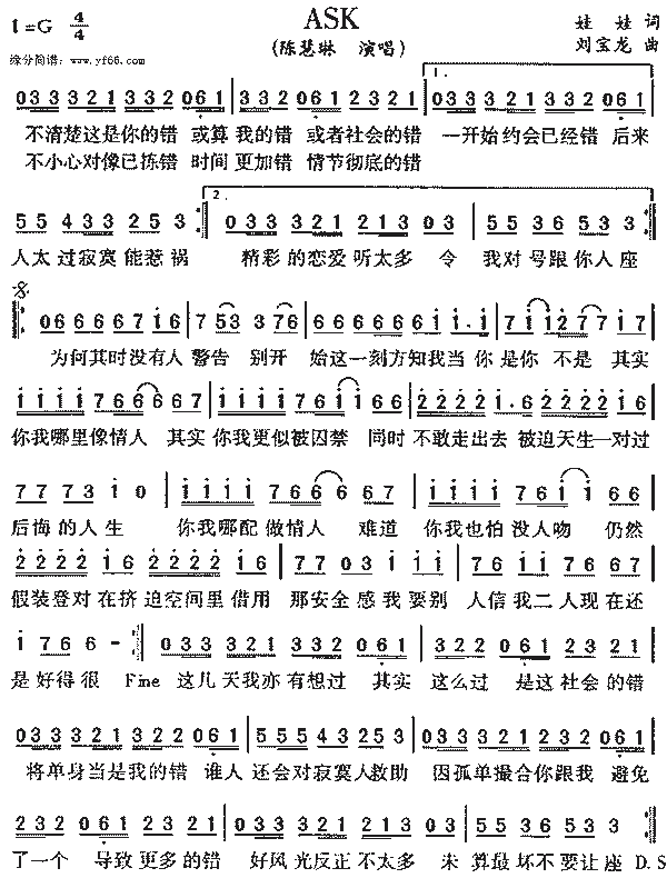 ask 不清楚这是你的错 或算我的错或者社会的错 一开始约会已经错 原来人太过寂寞能惹祸 不小心对象已拣错 时间更加错情节彻底的错 精彩的恋爱听太多 令我对号跟你入座 为何其时没有人警告别开始 这一刻方知我当你是你不是 其实系我哪里像情人其实你我更似被囚禁 同时不敢走出去被迫天生一对过后悔的人生 你我哪配做情人难道你我也怕没人吻 仍然假装很登对在挤迫空间里 借用那安全感 我要别人信我二人现在还是好得很 这几天我亦有想过 共你这么过是这社会的错 将单身当是我的错 谁人还会对寂寞人救助 因孤单撮合你跟我 避免了一个导致更多的错 好风光反正不太多未算最坏不要让座 你我哪配做情人其实你我更似被囚禁 |