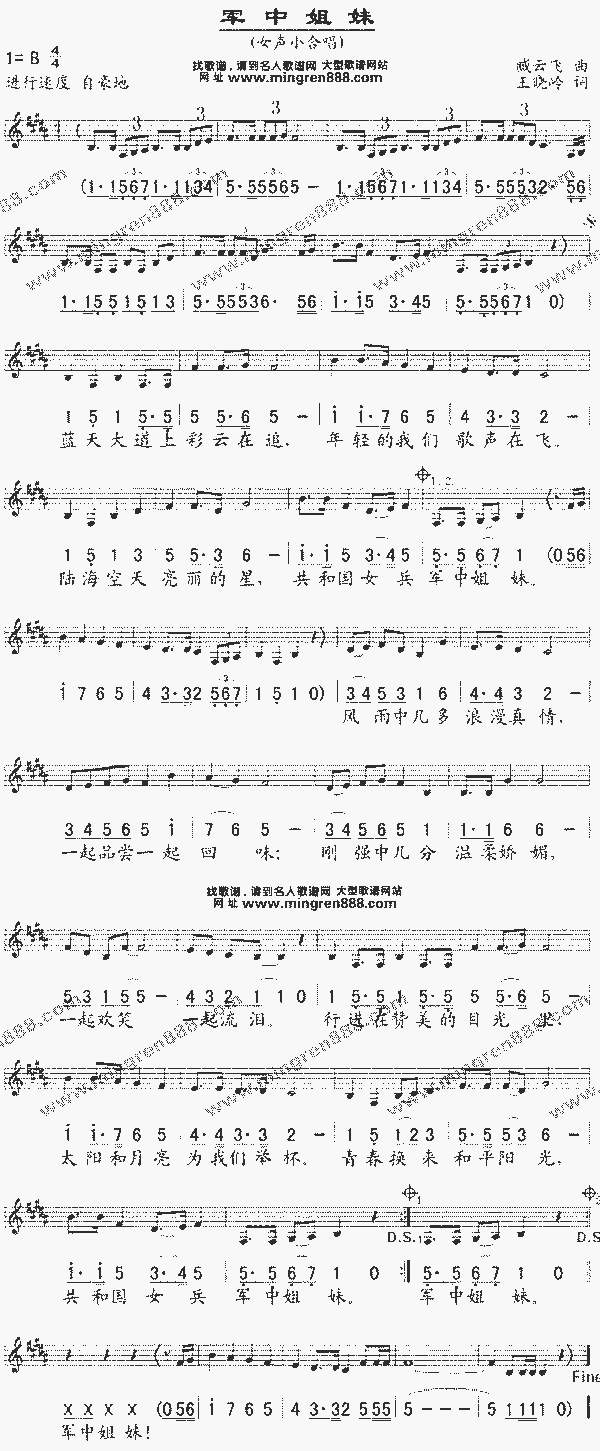 (白)一二三四向右看,一二,一二三四 蓝天大道上彩云在追, 年轻的我们歌声在飞 ;陆海空天亮丽的星, 共和国女兵军中姐妹. 风雨中几多浪漫真情, 一起品偿一起回味; 刚强中几分温柔妖媚, 一起欢笑一起流泪. 行进在赞美的目光里, 太阳和月亮为我们举杯. 青春换来和平阳光, 共和国女兵军中姐妹. 蓝天大道上彩云在追, 年轻的我们歌声在飞; 陆海空天亮丽的星, 共和国女兵军中姐妹. 风雨中几多浪漫真情, 一起品偿一起回味; 刚强中几分温柔妖媚, 一起欢笑一起流泪. 行进在赞美的目光里, 太阳和月亮为我们举杯. 青春换来和平阳光, 共和国女兵军中姐妹. 蓝天大道上彩云在追, 年轻的我们歌声在飞; 陆海空天亮丽的星, 共和国女兵军中姐妹. 蓝天大道上彩云在追, 年轻的我们歌声在飞; 陆海空天亮丽的星, 共和国女兵军中姐妹. |
