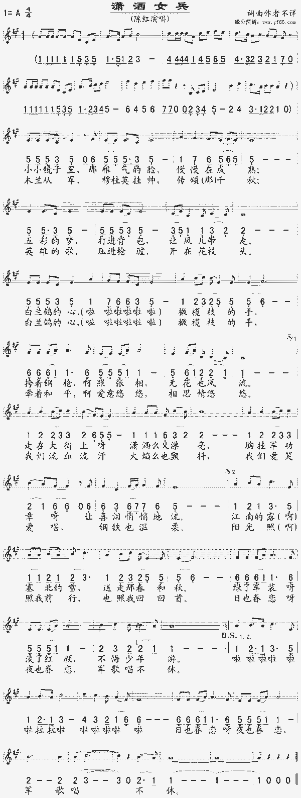 小小镜子里那稚气的脸慢慢在成熟 五彩的梦打进背包让风儿带走 白兰鸽的心(啦啦啦啦啦啦)橄榄枝的手 挎着钢枪啊照张相无花也风流 走在大街上呀故意雄赳赳 夜晚想家的时候让泪水悄悄地流 江南的露(啊)塞北的雪送走和那春和秋 绿了军装啊淡了红颜不悔少年游 木兰从军,穆桂英挂帅传颂(那)千秋 英雄的歌压进枪膛开在花枝头 白兰鸽的心(啦啦啦啦啦啦)橄榄枝的手 牵着和平啊爱意悠悠相思情悠悠 我们流血流汗呀火焰也颤抖 我们爱笑爱唱,钢铁也温柔 阳光照(啊)照我前行也照我回回首 日也眷恋啊夜也眷恋军歌唱不休 啦啦啦啦啦啦…… |